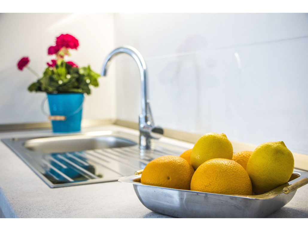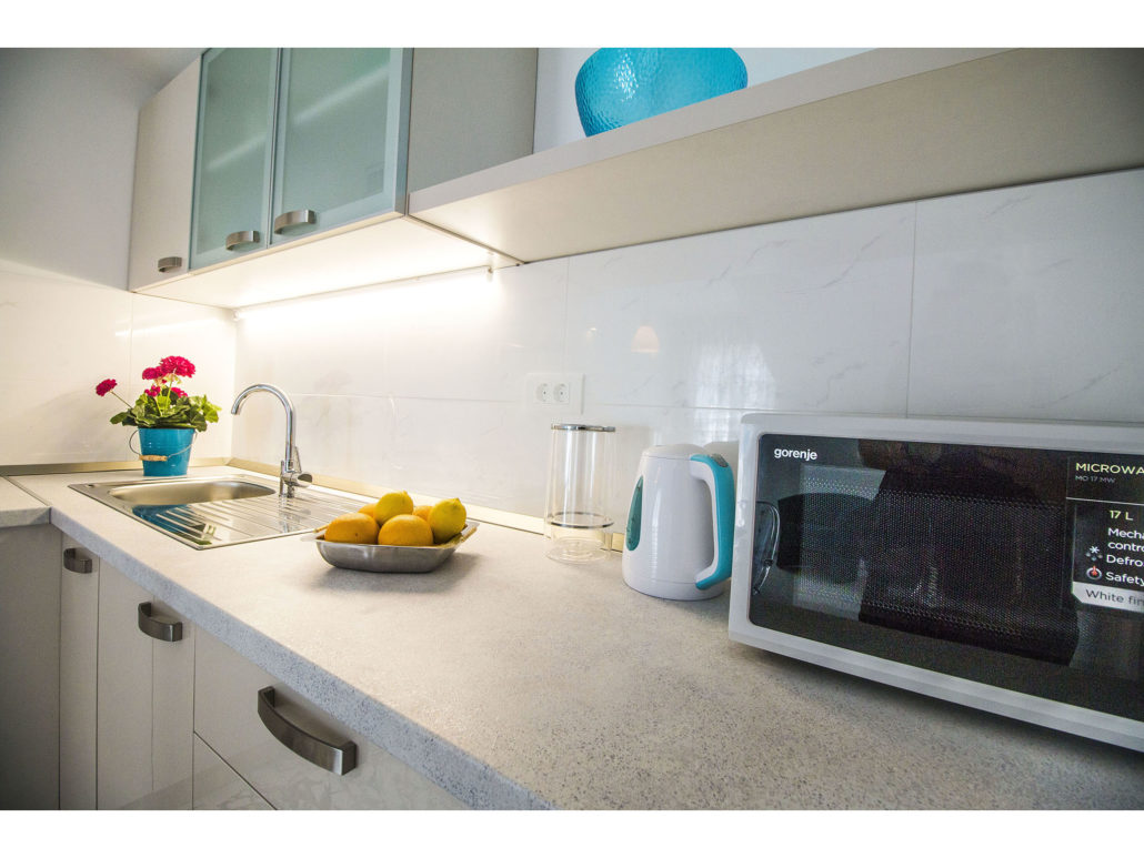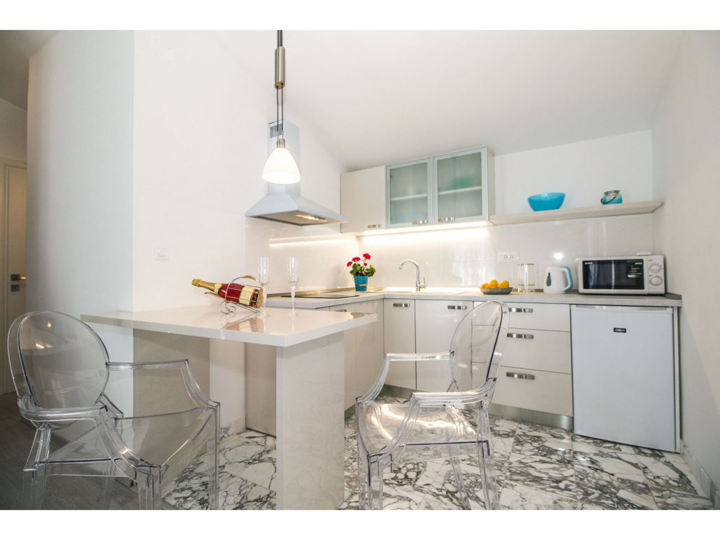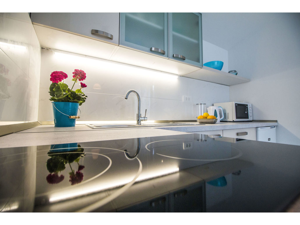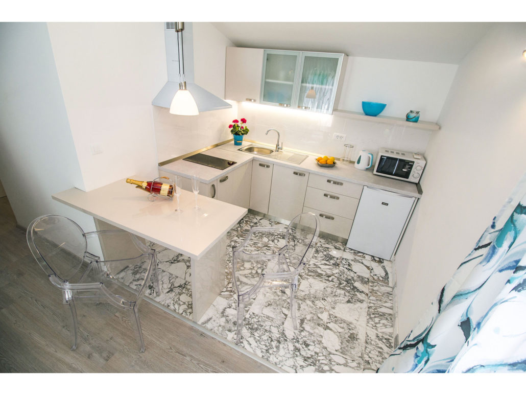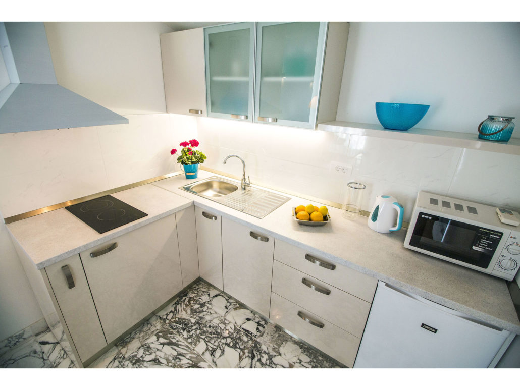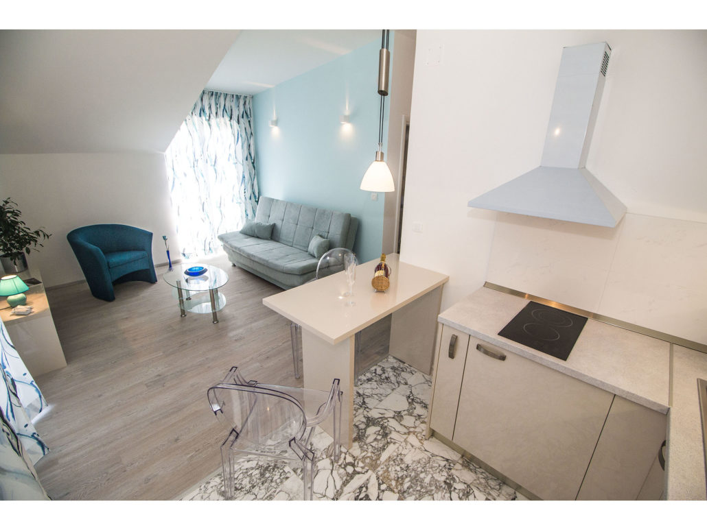 The kitchen, dining room and living room are in one open-space room from which you go out to the balcony/terrace.