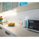 The kitchen includes a hob, refrigerator with freezer, electric kettle, microwave oven, and a set of kitchen utensils for 4 persons.